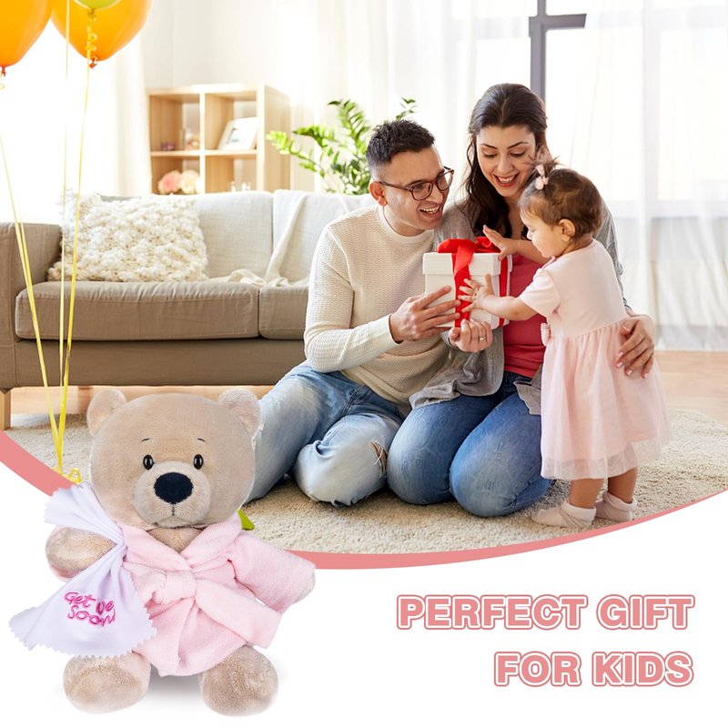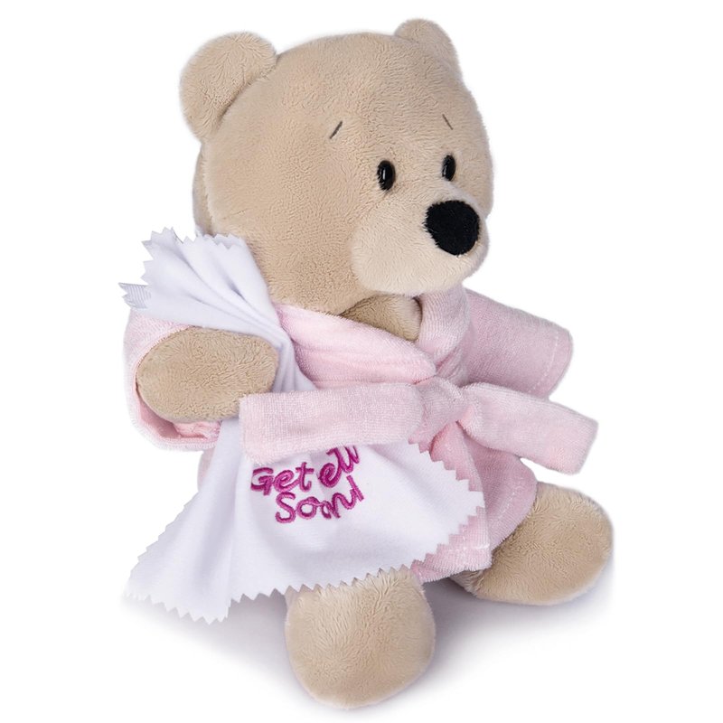 - Cute image: Adorable plush teddy bear "get well soon" in pink bathrobe and soothing towel. Exquisite workmanship and very soft.