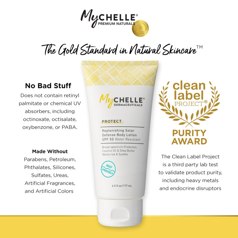 - MYCHELLE PROTECT: Our sun care collection is designed to protect your skin against premature aging symptoms through a broad-spectrum formula; This reef safe zinc sunscreen lotion keeps you sun-safe year round