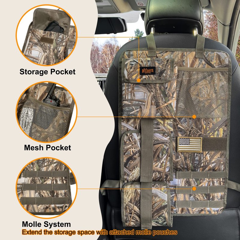 - EASY TO INSTALL:MYDAYS seat back gun rack with two adjustable straps with quick release buckles, easy to loop around your auto headrest and at the bottom of the seat back, a convenient car rear seat organizer for your rifles.This molle seat organier includes 2 packs.