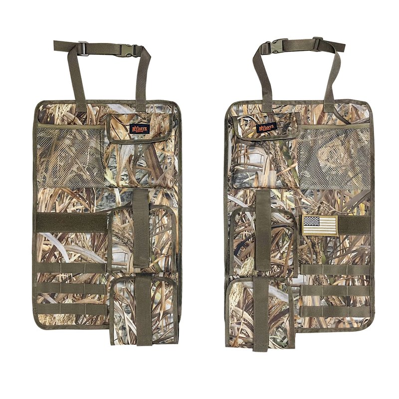 - MOLLE DESIGN: MYDAYS seat back gun rack have 3 rows of molle panel for hunting gear and accessories can be connected to more molle bags. 2 gun rack holder securely hold up to 2 rifles.A pocket with lid and a mesh pocket at the top for more hunting stuff. Included one US Flag Embroidered Patch.