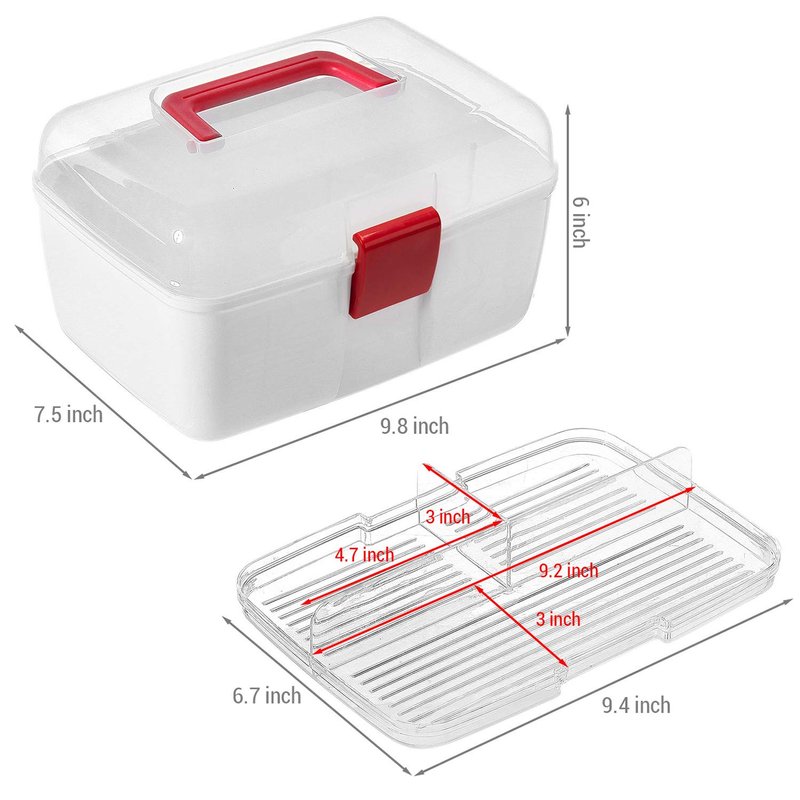 Keep your medical supplies conveniently on hand for any emergency situation with this clear top first aid kit travel case. Featuring a durable premium quality plastic construction, this portable family emergency kit tackle box features a detachable tray with compartments for storing ointments, bandages, gauze, cleaning solutions, and much more, which can be easily removed from the first aid travel case to store additional supplies. Its folding top red handle allows you to easily carry your medical accessories wherever you need to go, and features a locking latch to keep your supplies secure during transport. Not only can this carrier be used for first aid supplies, it is great for storing arts and crafts, makeup, and other hobbies or interests. Perfect for keeping your first aid supplies accessible in your car, home or office, this portable first aid travel storage box is an indispensable medical accessory for any emergency situation.