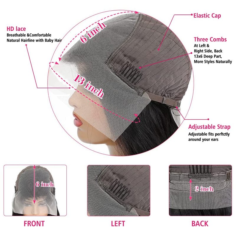 - Wig Cap: HD Straight Lace Front Wigs Human Hair, Natural Color,150% Density, 240 Gram,3 Combs Inside To Secure, 21.5-23.5 Inch Medium Cap With A Stretched Elastic Band To Adjust The Cap Size. Use Of High-Quality Rose Nets Makes It More Breathable And Makes It More Comfortable For Our Heads.