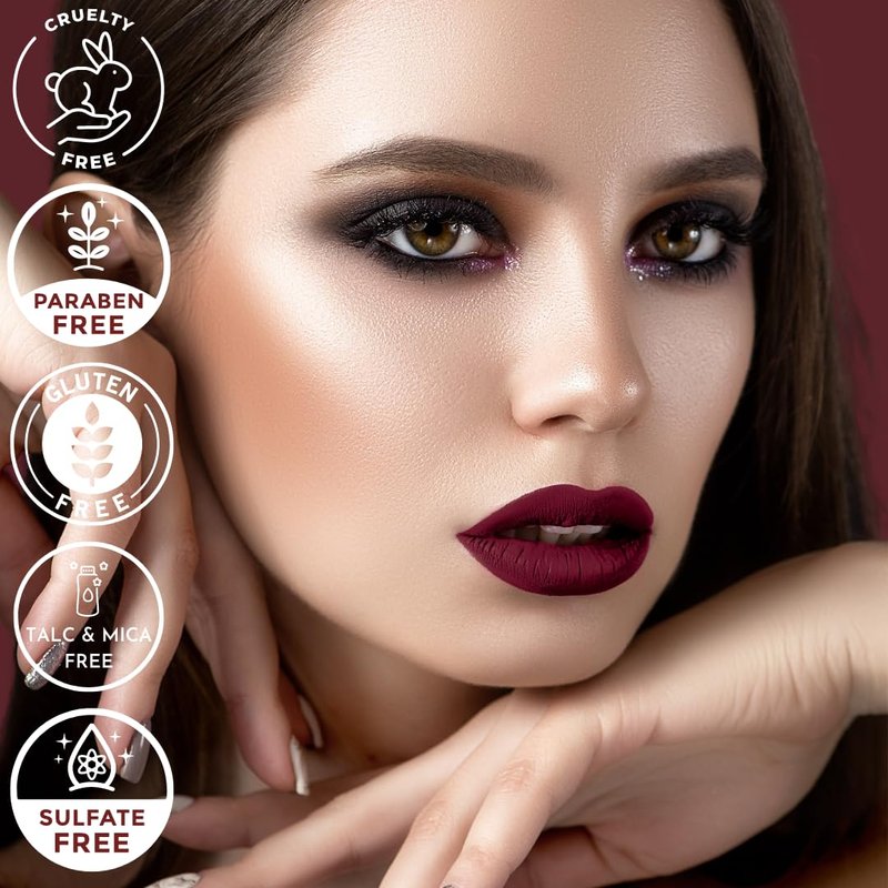 - LONG-LASTING ELEGANCE: Our burgundy red vegan liquid matte lipstick delivers hours of vibrant color for a look that stays flawless from morning to night, just reapply after eating. Smudge-proof high impact color liquid lip stain