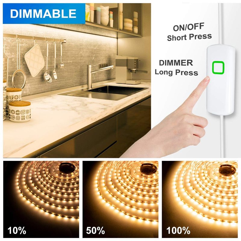 - DIMMABLE : Allow to adjust 10 levels brightness (10-100%), long press to adjust brightness between maximum and minimum, and the strip lights will flash when you get the limit,short press to control ON/OFF . (The dimmer can be able to stick on the wall, easy to control.)