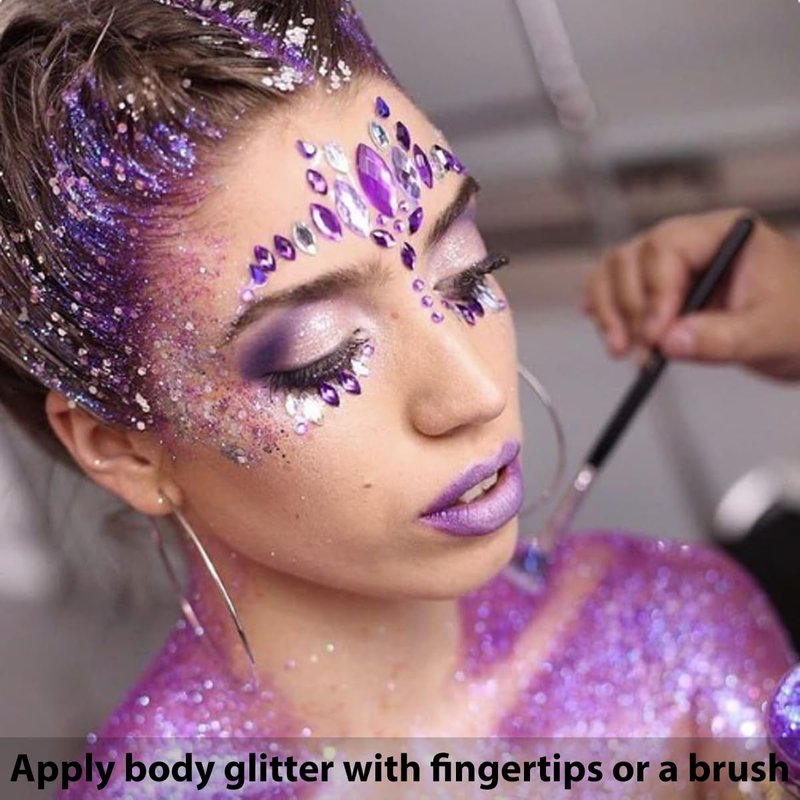 - Easy Application: Body glitters are adhesive with glitter gel,no glitter glue required.Glitters stick on and dry immediately.Easy to control the amount applied.Sparingly apply for a subtle look or layer more for an intense dramatic effect.TIPS: Apply face glitter with your fingertips or a brush