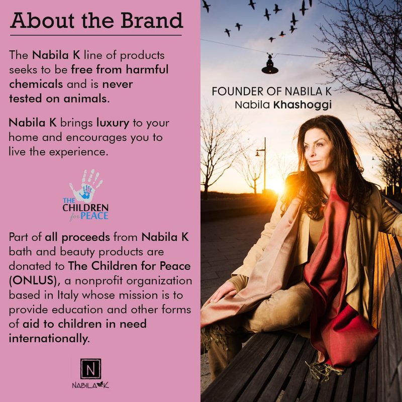 - A portion of all proceeds from N Nabila K bath and beauty products is donated to The Children for Peace Onlus (ONLUS) a nonprofit organization based in Italy whose mission is to provide education and other forms of aid to children in Third World countries.