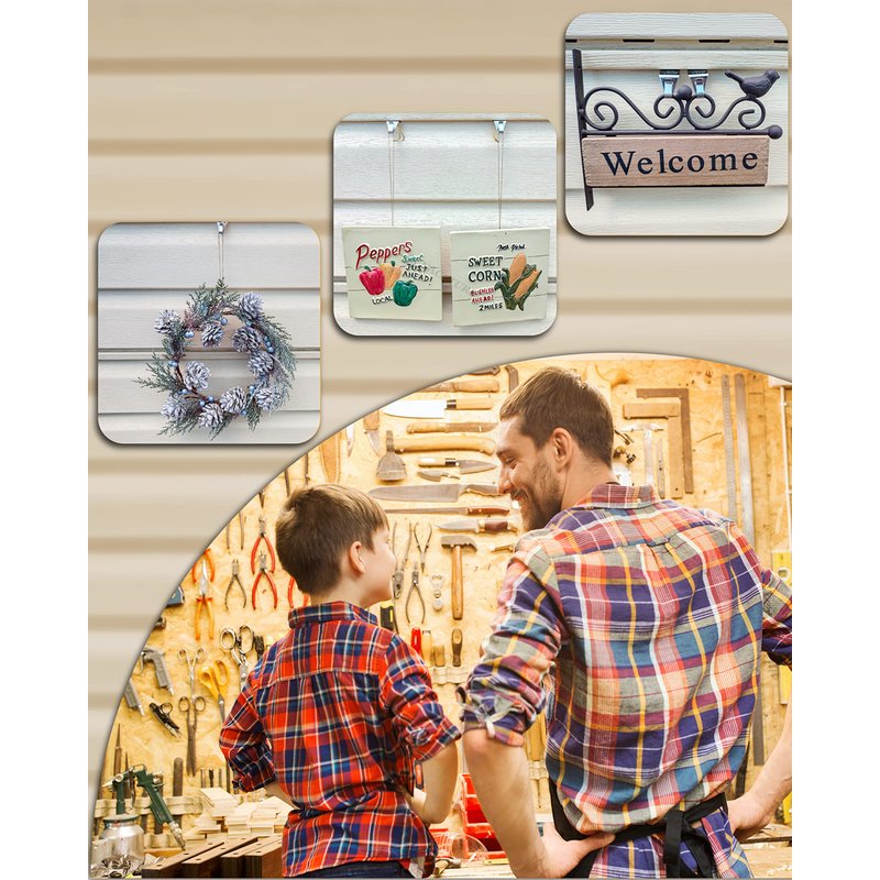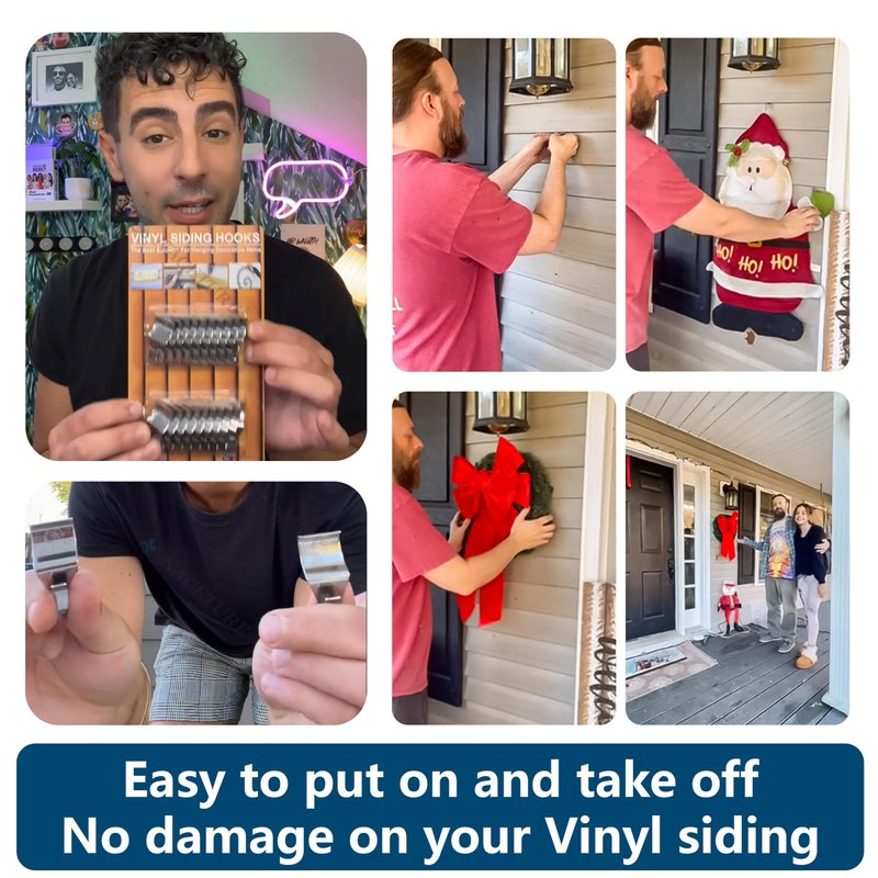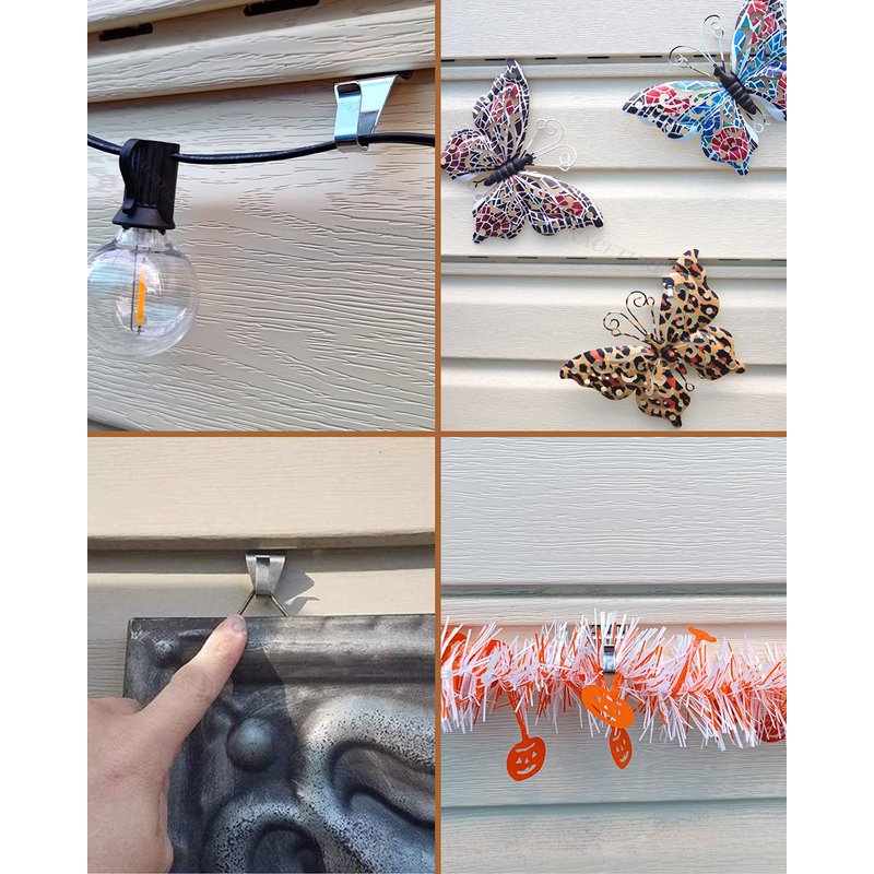 How to use?Simply slide the curved hook head under the siding you want to use to hang your home or business decorations. The unique curved design allows you to easily Installs,remove and relocate the vinyl siding hooks.