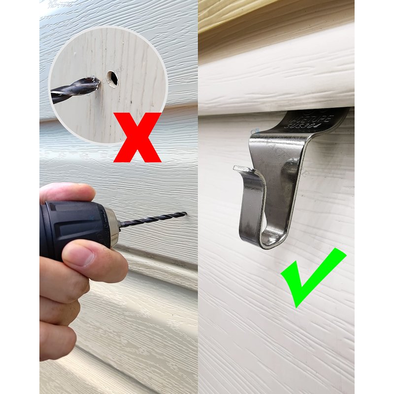 Quality You Can TrustUnlike fragile plastic hangers, we’ve designed our no hole needed vinyl siding hooksusing 304 Stainless Steel which is rustproof, sturdy and heavy duty for years of use. Holds up to 18 lb per hook. Rust-free and will never leave stains on your vinyl siding wherein offering you with numerous hanging possibilities at your fingertips for years.