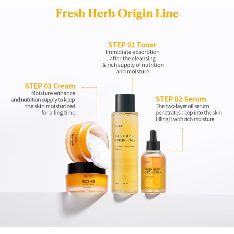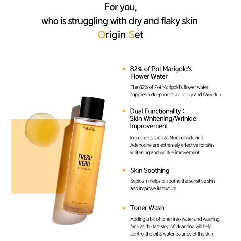 - Calendula Infused Toner: Enjoy our Fresh Herb Origin Toner 150ml, enriched with Calendula Flower Water brewed through a tincture method. This dual-functional toner brightens and addresses wrinkles, removing impurities. Suitable for all skin types, including sensitive and irritated skin