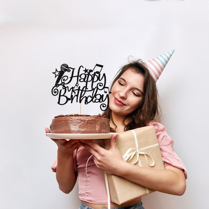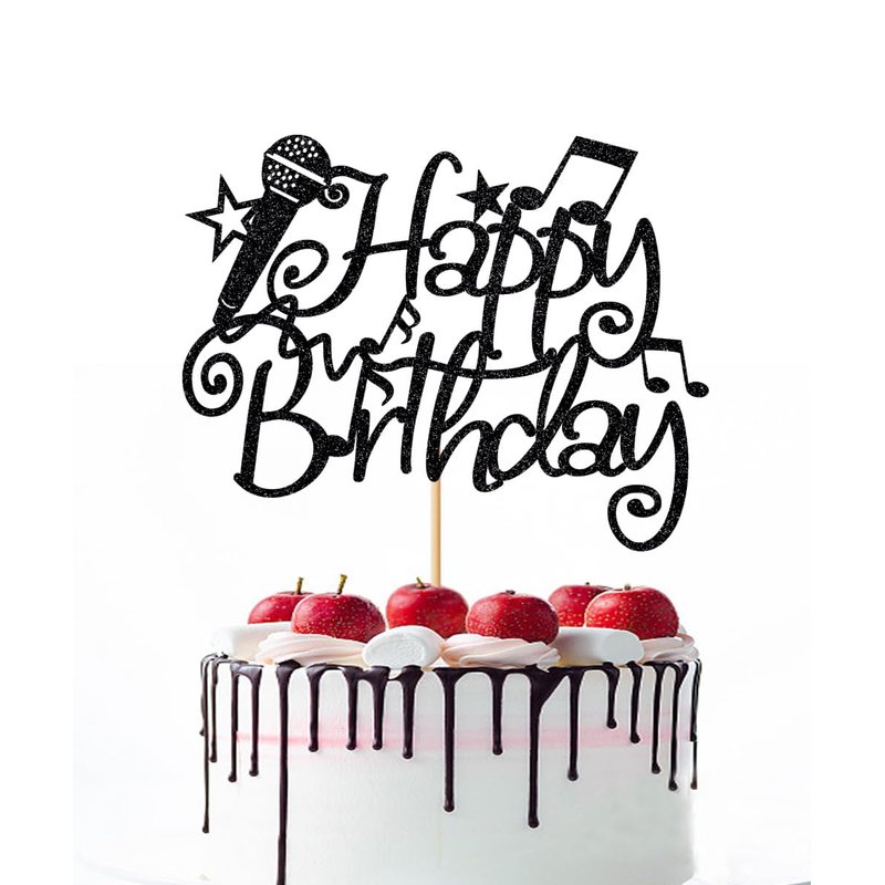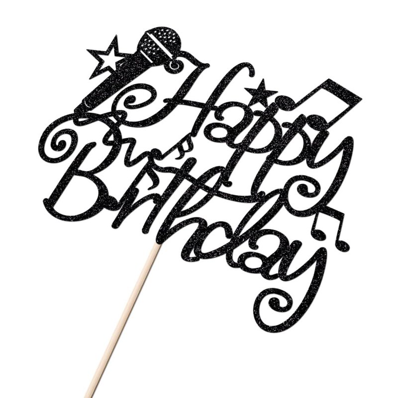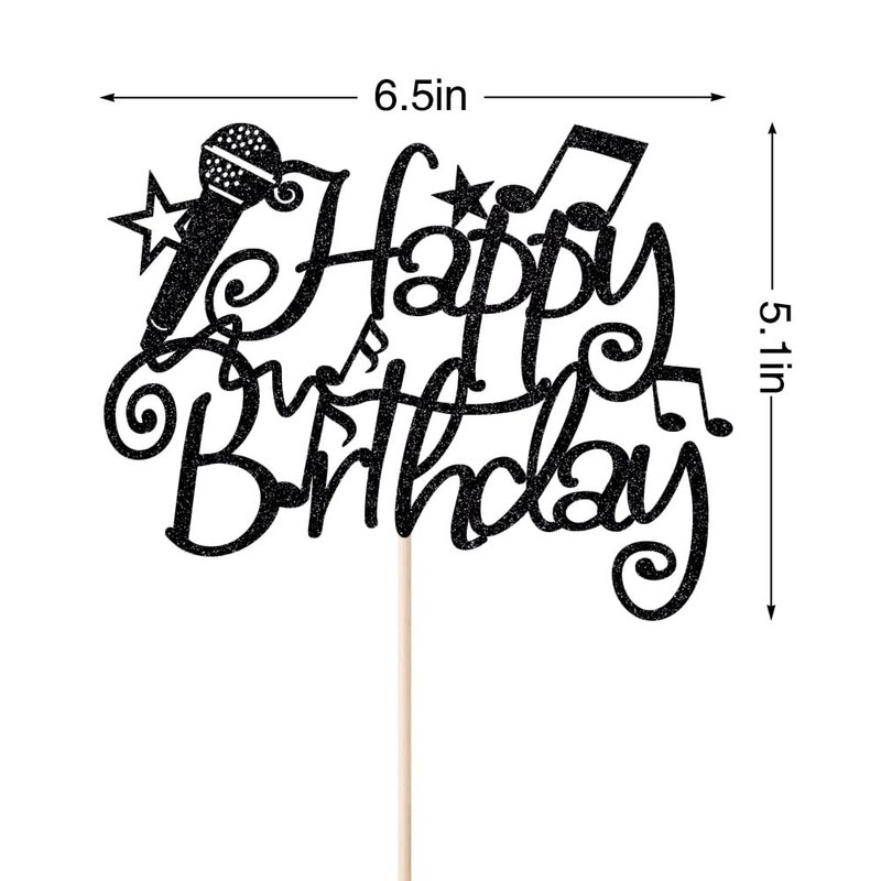 Black Glitter Microphone Happy Birthday Cake Topper,Music Lover Birthday Decorations,Karaoke Musical Theme Birthday Party Supplies for Boys Girls