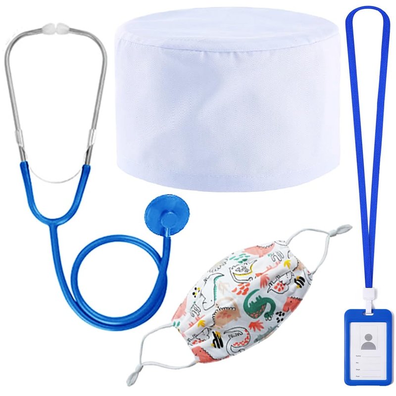 - Doctor coat set include: 1 x Coat, 1 x Cap, 1 x Mask, 1 x Stethoscope Prop, 1 x ID card holder.