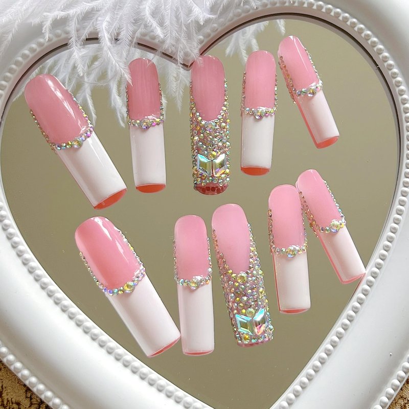 - SPARKLE ALL NIGHT: 10 pieces per set of long coffin press on nails featuring beautiful glitter and rhinestone accents to dazzle from day till night