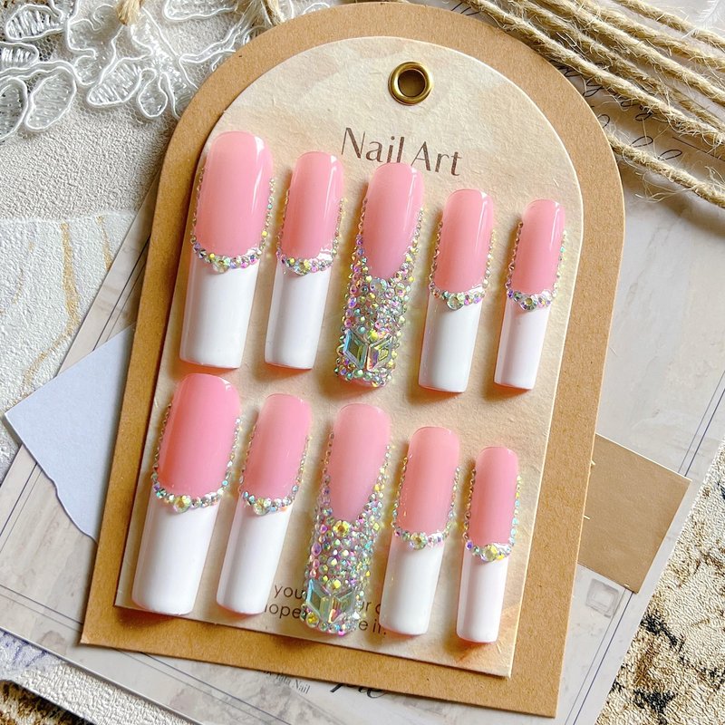 This has 2 size, S and M. Check the pic of how to choose the right size. Most people choose M size. All parts are handmade, including the gel polish apply, rhinestone apply, there may be a chance that the rhinestone will be fallen off when you pick the tips from the package. When you take out, very careful and gentle, if rhinestones drop off, you can use glue to stick on it. These glittering rhinestone nails are perfect for your next night out. The set includes 10 coffin shaped press-on nails in various glitter designs, sure to add sparkle to your fingertips. Whether you're attending a party or special event, these long nails will glam up any outfit with high-shine shimmer. The flexible plastic material conforms comfortably to your natural nails for an effortless manicure you can do yourself in minutes. Wear them to dazzle on the dance floor or simply to feel extra glamorous.