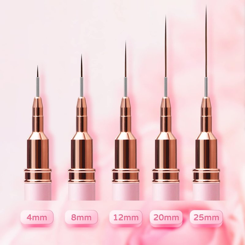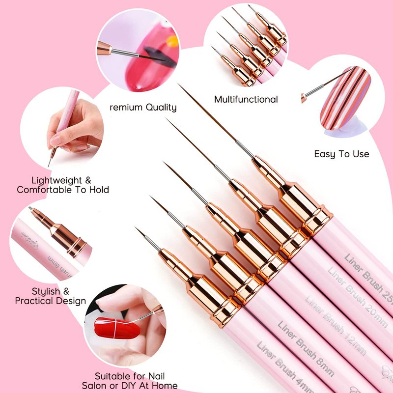 - 💋 Professional Nail Art Brushes: The thin nail art brush set contains 5 different size nail brushes, sizes for nail liner brushes heads: 7mm, 9mm, 11mm, 15mm and 25mm.These liner brushes for nail can achieve the tiny details and fine lines needed for painting nail designs, which are perfect for professional nail salon and nail art lovers!Buy Best Gift for girl friend, daughter, and mother who love manicure on Birthday, Christmas, Thanksgiving and Halloween.