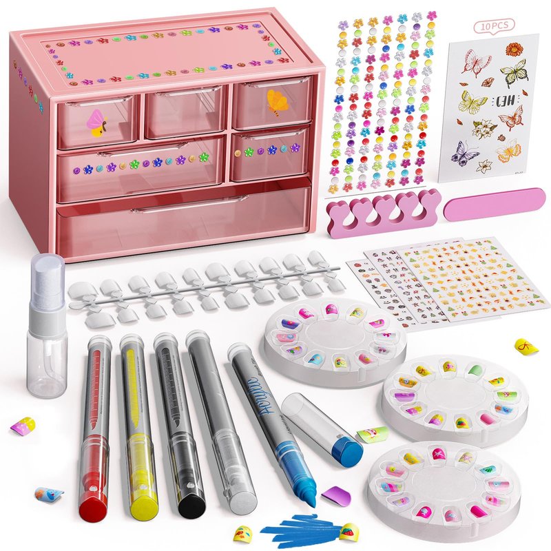 Nail Art Pens Set For Grils, Diy Kids Nail Art Kits With 3D Press-On Nail, Clear Fake Nail Tips, DIY Sticker, Nail Pen for Toddler Home & Salon Toys Gifts,Plastic Organizer