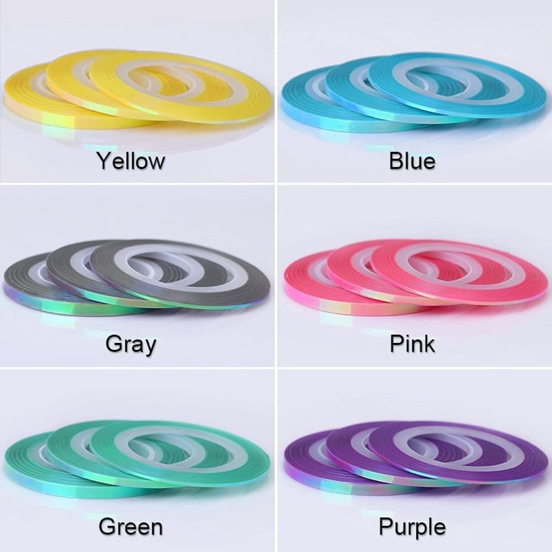 - The acrylic nail line tape colors are blue, yellow, purple, green, pink, light purple.Nails tape size are 1mm, 2mm, 3mm.3 sizes, each 6 colors, a total of 18 volumes.
