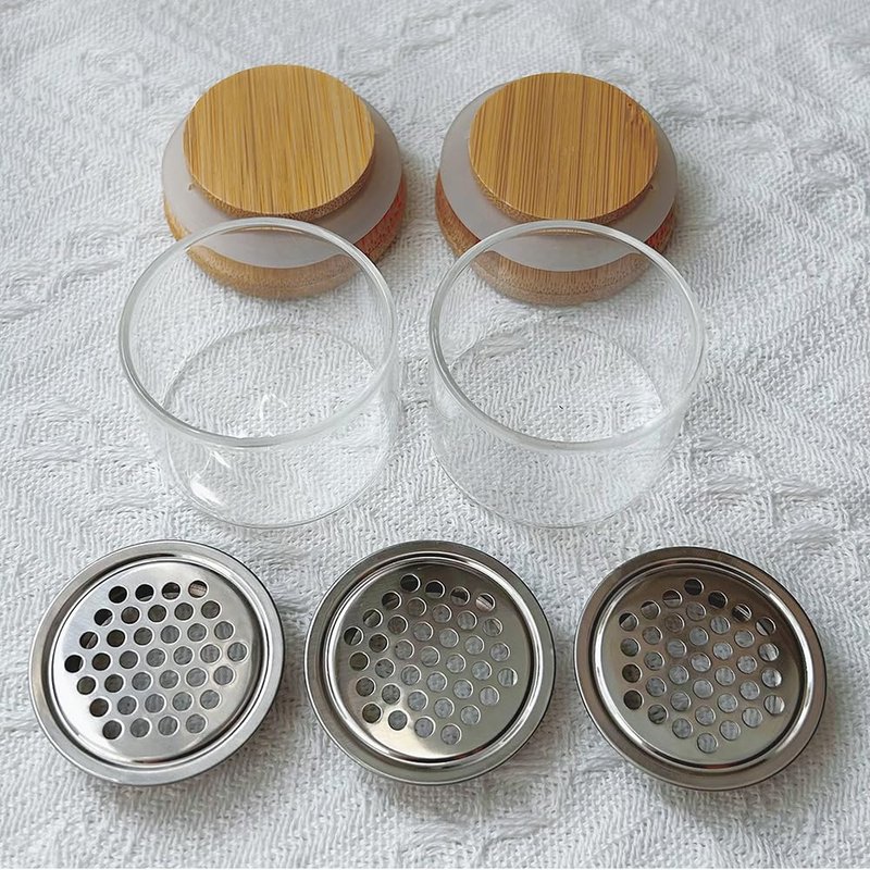 The nail brushes washing cup consist of glass cup, wood lid and alloy filter mesh.