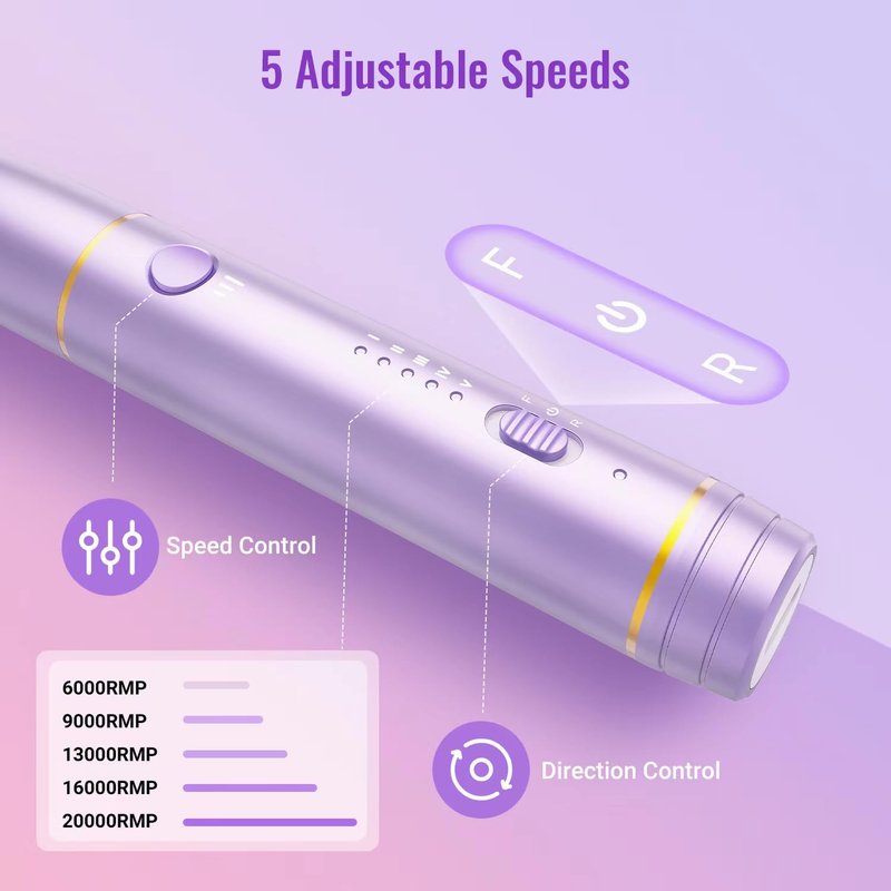 - 【5 Adjustable Speeds & Reverse Direction】Electric nail drill is designed with 6000-20,000RPM and 5 speeds, which makes this nail drill easier and safer to polish your nails (even as beginners). Forward and reverse rotation direction make it easy to use for both left hand and right hand