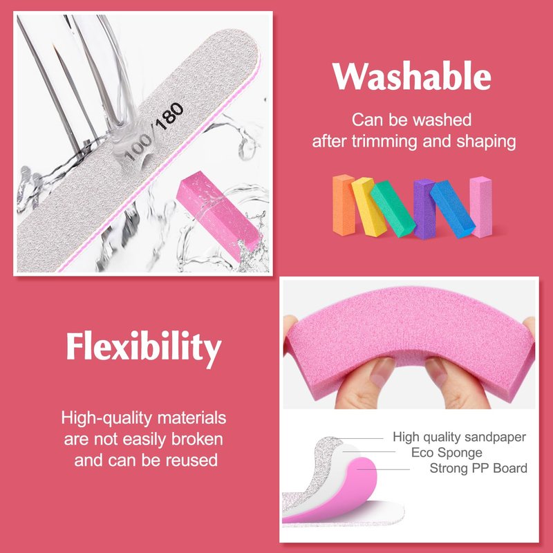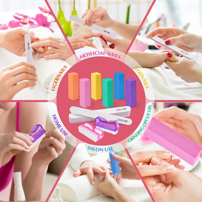 - Professional Nail Files and Buffers set: Package comes with 6pcs 100/180 grit double sided emery board nail files,6pcs 120 grit nail buffer blocks, 2pcs nail brushes. Must have in nail salon and DIY nail art at home.Ideal gift for people who love nail art.