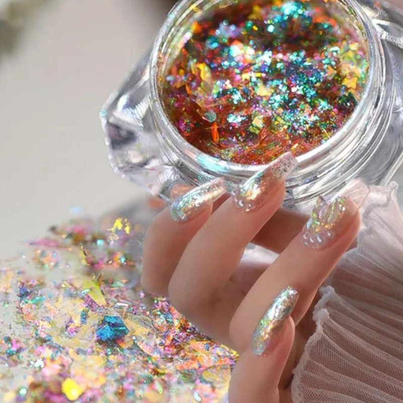 - Nail glitter flakes iridescent hexagon nail glitter: Irregular Patterns: chunky iridescent flakes are small and irregular, reflective, holographic and iridescent, could add more attractive to your face, eyes, hair or nail. they are thin and could stay longer than ordinary nail sequins. Huge nail dip kits with everything glitter nails for you.