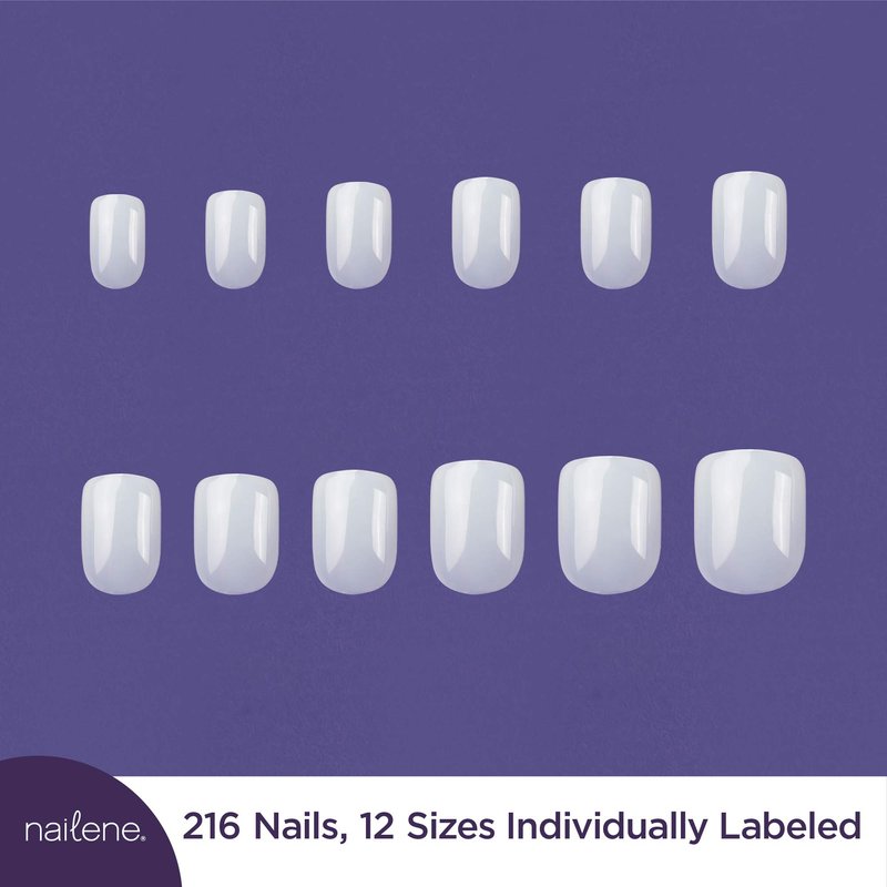 - FULL COVER FALSE NAILS – The Nailene So Natural Artificial Nail Kit contains 216 nails in 12 sizes, 1 bottle of nail glue & a double-sided buffer. These undecorated fake nails are perfect for the avid user—just polish or decorate for a flawless manicure!