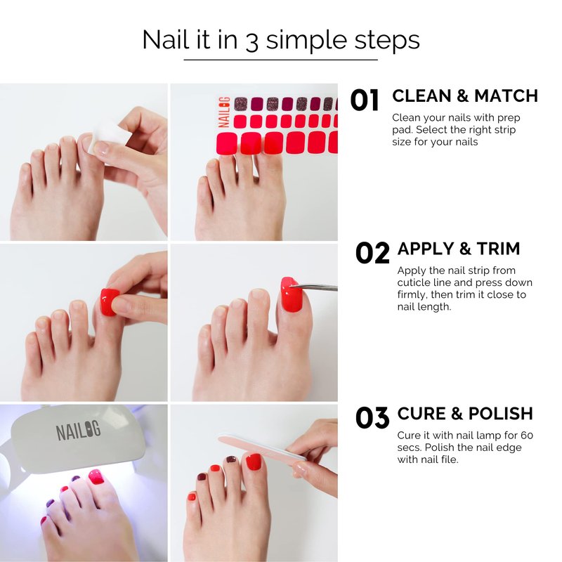 - TOE NAIL POLISH STRIPS - Nailog 32 pieces nail stickers are longer, wider and thicker than other semi cured nail stickers. -16 different sizes for you to choose. Designed to fit all nails.