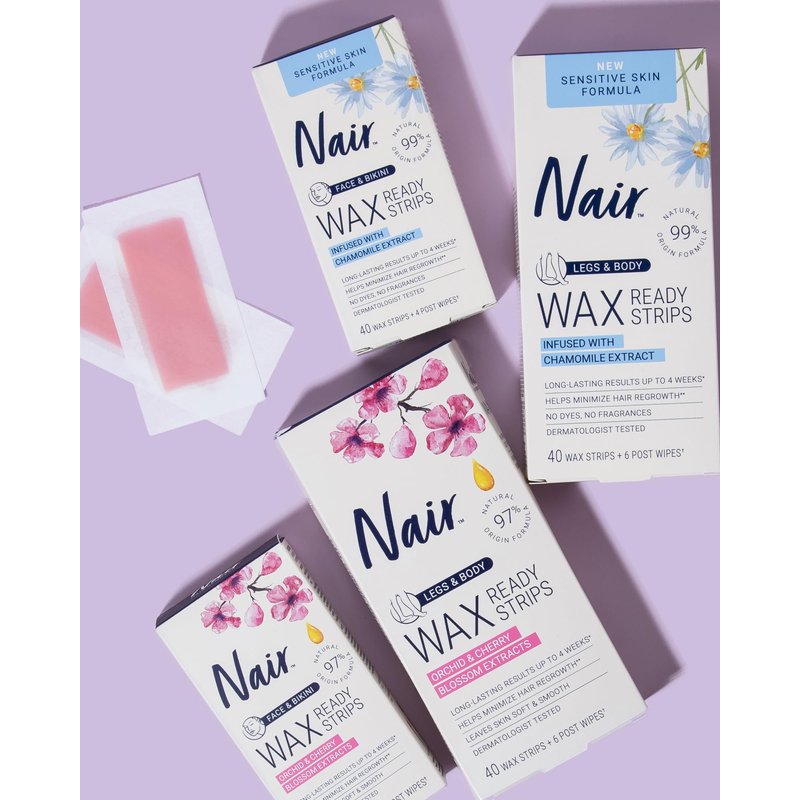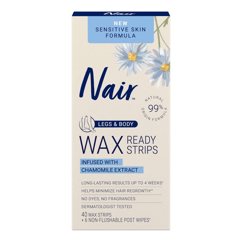 - One (1) 40-count box of Nair Sensitive Hair Remover Wax Ready Strips, Legs and Body Hair Removal Wax Strips with 40 hair remover wax strips and four post wipes