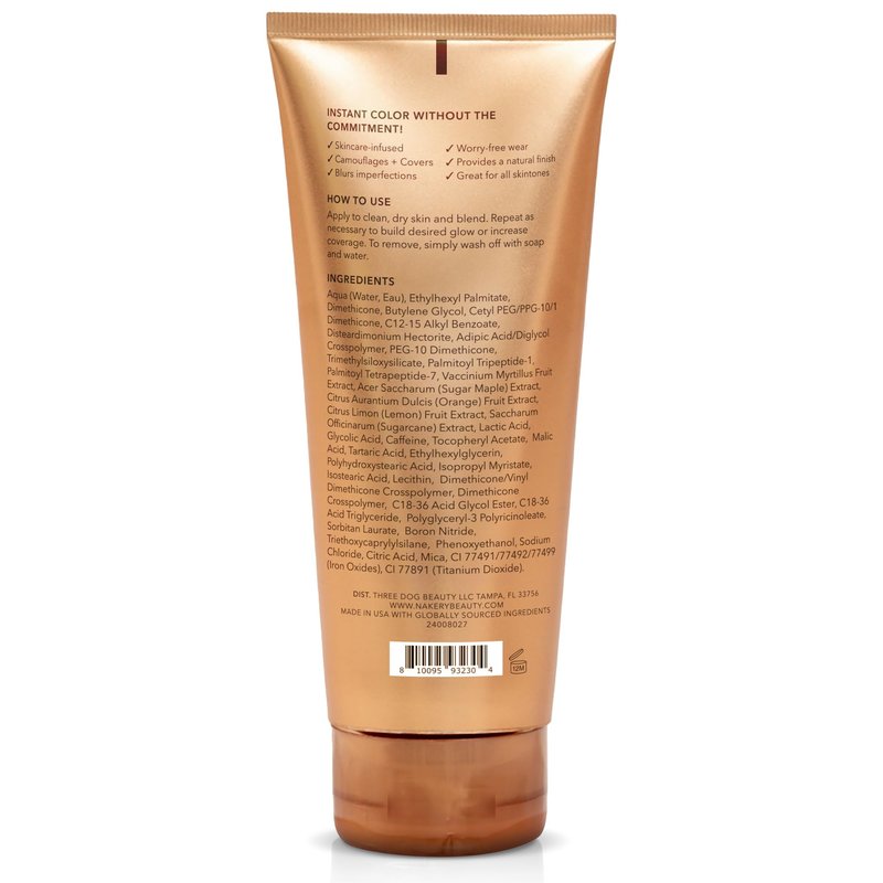 Elevate your beauty routine with Nakery Cream Liquid Bronzer. Our luxurious bronzing lotion combines skincare benefits with radiant results, giving you an instant tan that lasts all day. Say goodbye to dull, lackluster skin and hello to luminous radiance! Crafted with care, our body bronzer features clean ingredients that nourish and protect your skin. Vegan, cruelty-free, and gluten-free, it's a guilt-free indulgence you can feel good about. Plus, it's free from harsh chemicals like parabens, sulfates, and silicones, ensuring a gentle touch on even the most sensitive skin. But our bronzer isn't just about looks—it's about wellness too. Infused with niacinamide and antioxidants, it works to improve your skin's texture while enhancing its natural radiance. Say hello to healthier, more luminous skin with every application of our instant tan bronzer. And the best part? Our tinted body lotion is easy to use and versatile. Whether you're looking to add a subtle glow to your daily makeup routine or enhance your natural beauty for a special occasion, Nakery Cream Liquid Bronzer delivers flawless results every time. Experience the difference of Nakery Cream Liquid Bronzer today and discover the secret to radiant, sun-kissed skin that glows from within.