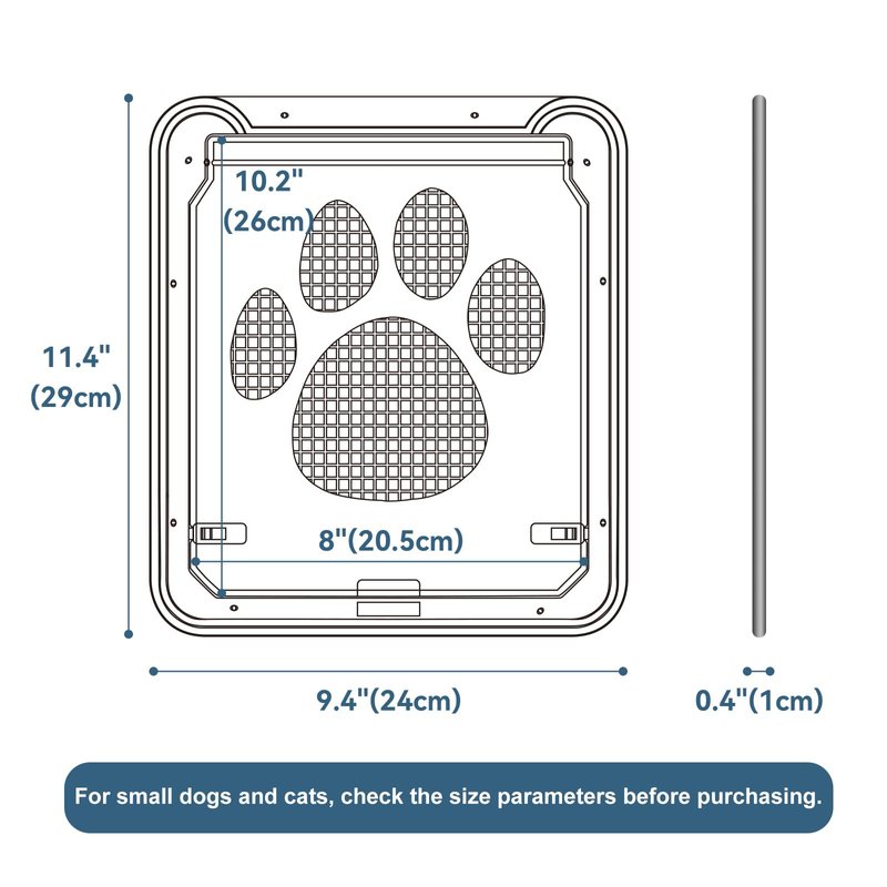 - Outside frame size: 9.4 x 11.4 inch, Inside flap opening size: 8 x 10 inch. Select and install this door by measuring the maximum width and height of the pets. Most less than 30 lb small dogs, cats or other small pets use it great, not for large dogs.