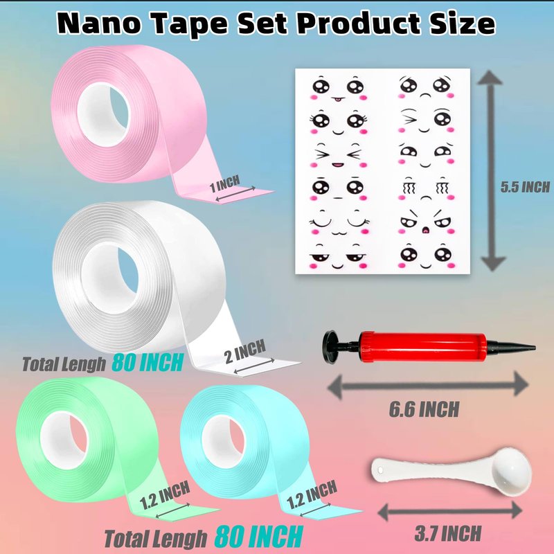 - Product includes: Nano Bubble Tape Kit including 4 rolls of nano tape ,, 1 spoon, 14 packs of different shapes and colours of glitter and 1 box of small macaron beads, 1 sheet of cute emoji stickers and 1 balloon inflator.