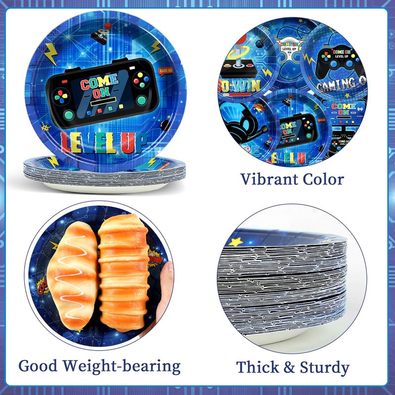 - Premium quality and printing: Our gaming theme paper plates decorations are crafted from thick cardboard, guaranteeing their durability and sturdiness without bending or leaking. This premium material can hold more food. Moreover, the video game dinner plates are printed with high-quality water-based ink, ensuring a pleasant dining experience for your valued guests.