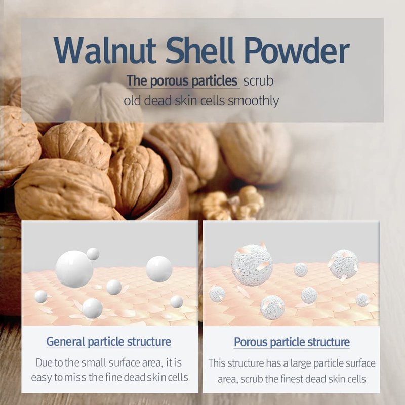 - 🌳 EFFECTIVELY DOUBLE SCRUB WITH NATURAL INGREDIENTS - Walnut Shell Powder has many minutes' pores on its surface therefore it's unique formula smoothly removes the impurities on the skin's surface. Sodium Chloride and Lactic Acid gently melt the dead skin cells, leaving the skin feeling soft without any irritating and stinging feeling.