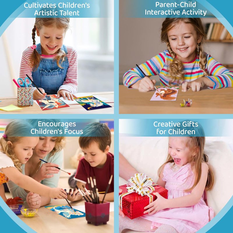 - 【Complete Digital Painting Set for Kids】 Our kit includes everything your child needs to start creating, with 4 pre-printed canvas sheets, 3 high-quality brushes, vibrant acrylic paints, and a detailed instruction booklet