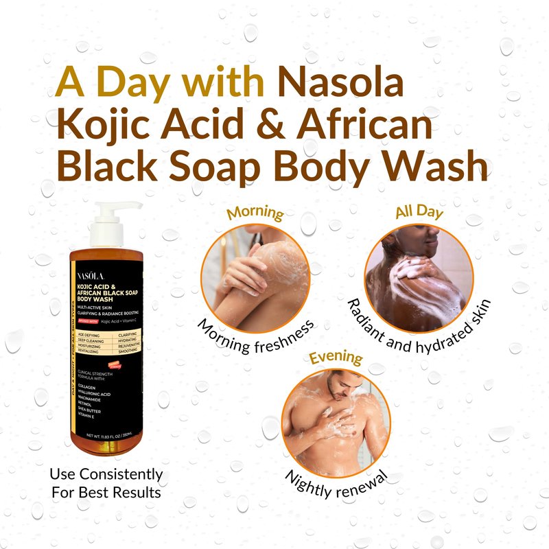 - Usage: Apply the Kojic Acid African Black Soap Body Wash on wet skin and gently massage for 2-3 minutes (up to 5 minutes if your skin can tolerate). For optimal results, rinse off the soap with hot water, then cool your skin with cold water to seal all pores, aiding the removal of damaged skin. Use 1 or 2 times daily for maximum benefits. Pair it with Nasola Kojic Acid Lotion and Body Scrub to amplify the radiance and effectiveness on your skin. And remember always to use sunscreen to protect the skin.