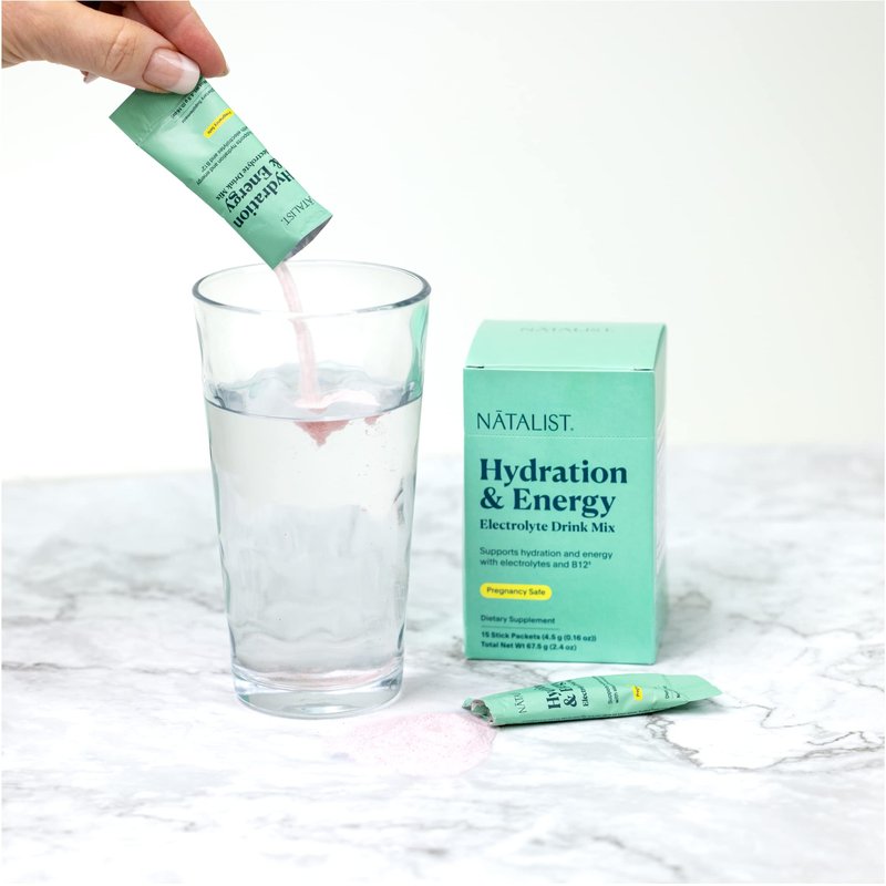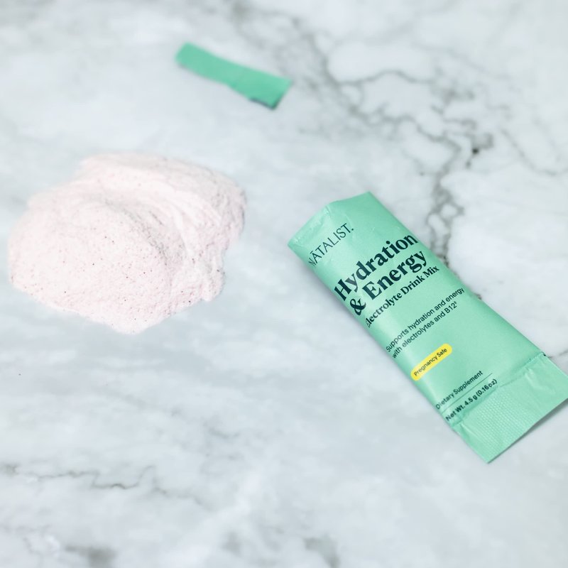 Our Hydration & Energy Electrolyte Drink Mix is specially formulated with key electrolyte ingredients including sodium, chloride, potassium, and magnesium as well as hyaluronic acid to support hydration. Plus, our hydration mix includes B12 to support energy levels through each trimester and beyond. This pregnancy-safe, breastfeeding-safe, and sugar-free electrolyte powder is a tasty alternative to water—because water gets old. Our Hydration & Energy Electrolyte Drink Mix will help you stay hydrated and energized throughout the day. Bonus, our convenient, single-serving, easy-open hydration packets are ideal for on-the-go support.*
