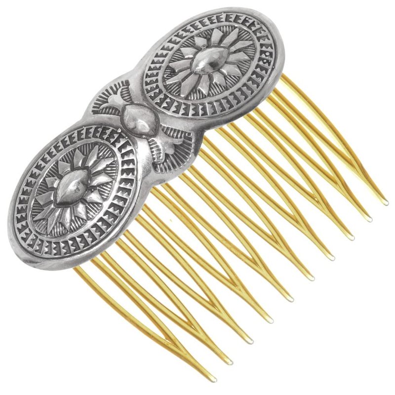 This Native American Hammered Sterling Hair Comb offers old pawn, Southwest style for young or old! The Silver is stamped with repoussé centers and lots of traditional details. Lightly antiqued, the scalloped metal is about 2-3/8" by 7/8" and is mounted securely onto a plastic comb. Navajo designed and made in our jewelry shop. This Native American Hammered Sterling Hair Comb is a perfect accent to your Turquoise or Coral earrings!