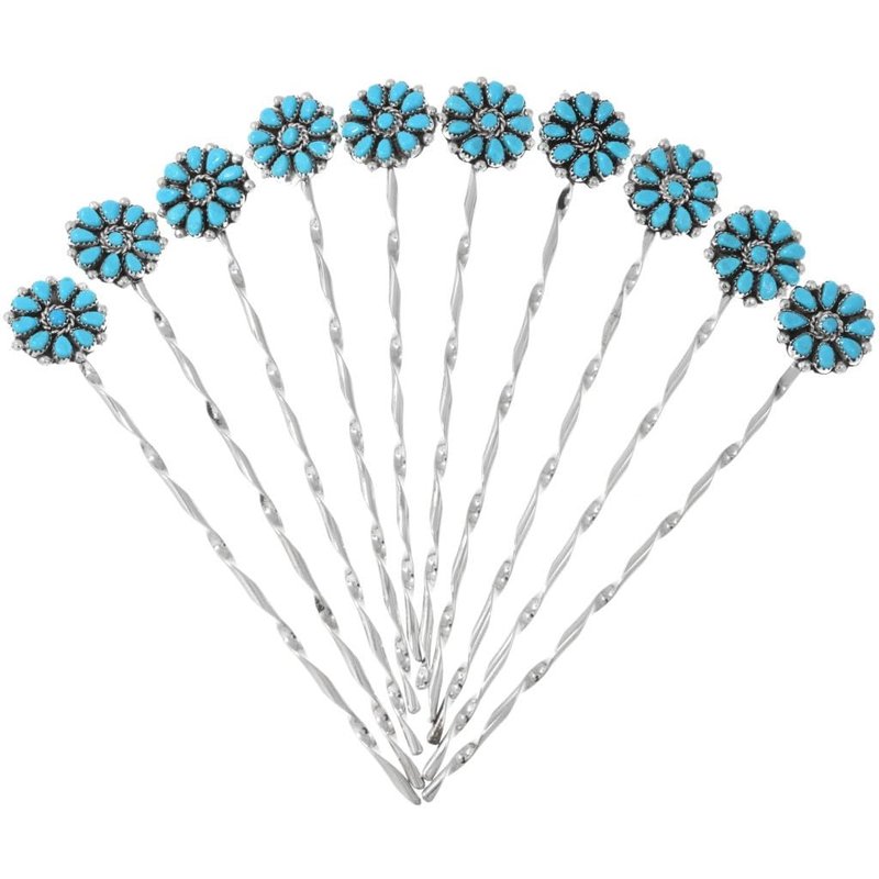 This Navajo Turquoise Cluster Silver Hair Stick will add a pretty dose of Southwest color to your hairdo! A perfect size for ladies and teens, this traditional twisted stick design is handcrafted in German Silver with tiny drops and a twist wire, to accent the block (man-made) turquoise stones. It's almost 7/8" wide and 6" long. From our jewelry shop by Native American smith, Christopher Begay. This affordable, Navajo Turquoise Cluster Silver Hair Stick brings traditional style to every occasion!