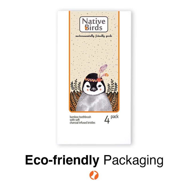 Native Birds Bamboo Toothbrush with Soft Charcoal Infused Bristles, Set of 4, Designed in Ukraine