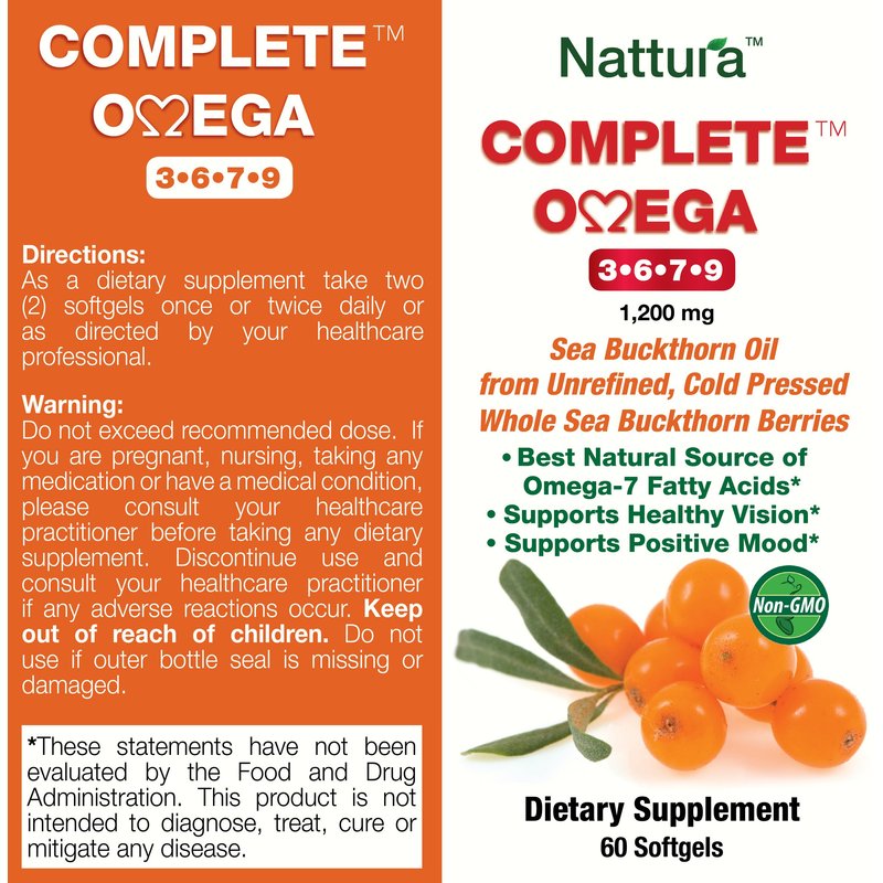Nattura Complete Omega 3-6-7-9, Pure Sea Buckthorn Oil, European Quality, from Unrefined, Cold Pressed Whole Sea Buckthorn Wild Berries - 1,200mg - 2 Bottles