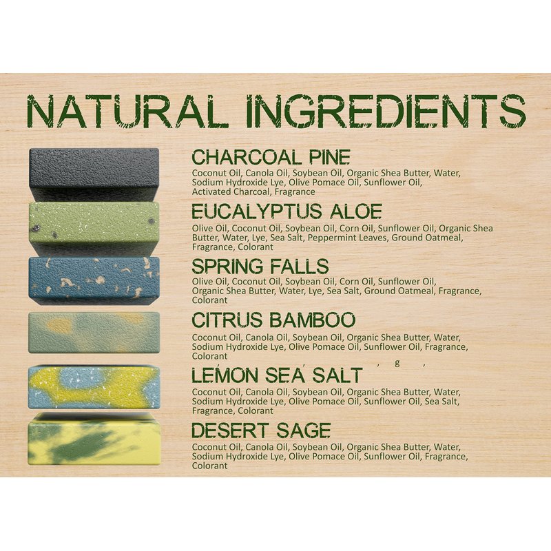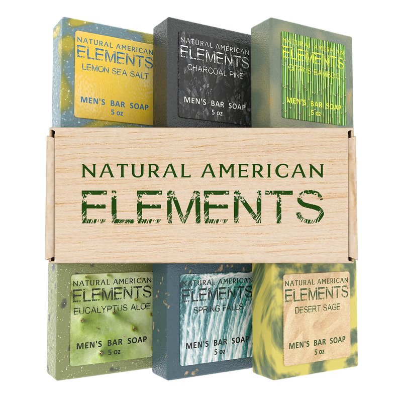 - ★ NATURAL ELEMENTS – ELEMENTS Men’s Soap includes (6) 5 oz bars of men’s soap. Each bar represents the natural ingredients and scents crafted to perfection from the USA: CHARCOAL PINE, EUCALYPTUS ALOE, SPRING FALLS, CITRUS BAMBOO, LEMON SEA SALT, and DESERT SAGE. We promise you will love the natural men’s soap experience.