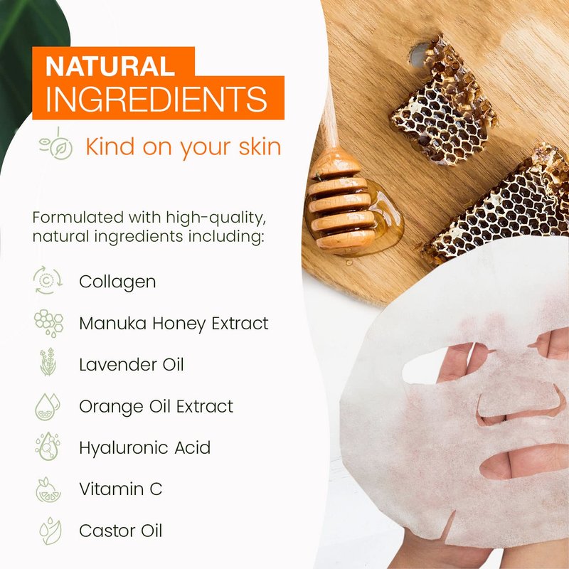 - NATURAL INGREDIENTS: Crafted with care, our sheet mask contains premium natural ingredients like Collagen and Manuka Honey, known for their skin-loving properties. Treat your skin to the best nature has to offer.
