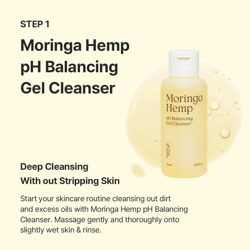 - [pH Balancing Cleanser] – The Moringa Hemp pH Balancing Gel Cleanser gently removes impurities, leaving your skin feeling refreshed and thoroughly clean.