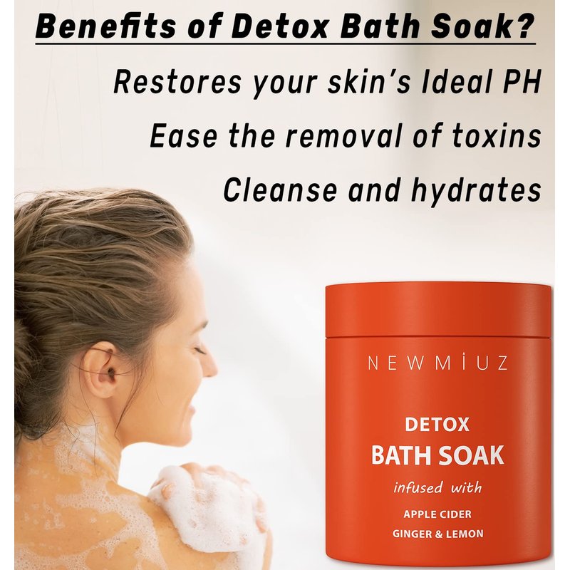 - Detox Bath soak - New Miuz's luxurious Detox bath soak salt powder Cleanse, hydrate and restore PH balance of your skin. Our natural relaxing aromatherapy detoxifying bath salt is infused with apple cider, ginger and lemon essential oils and other nutritious natural ingredients.