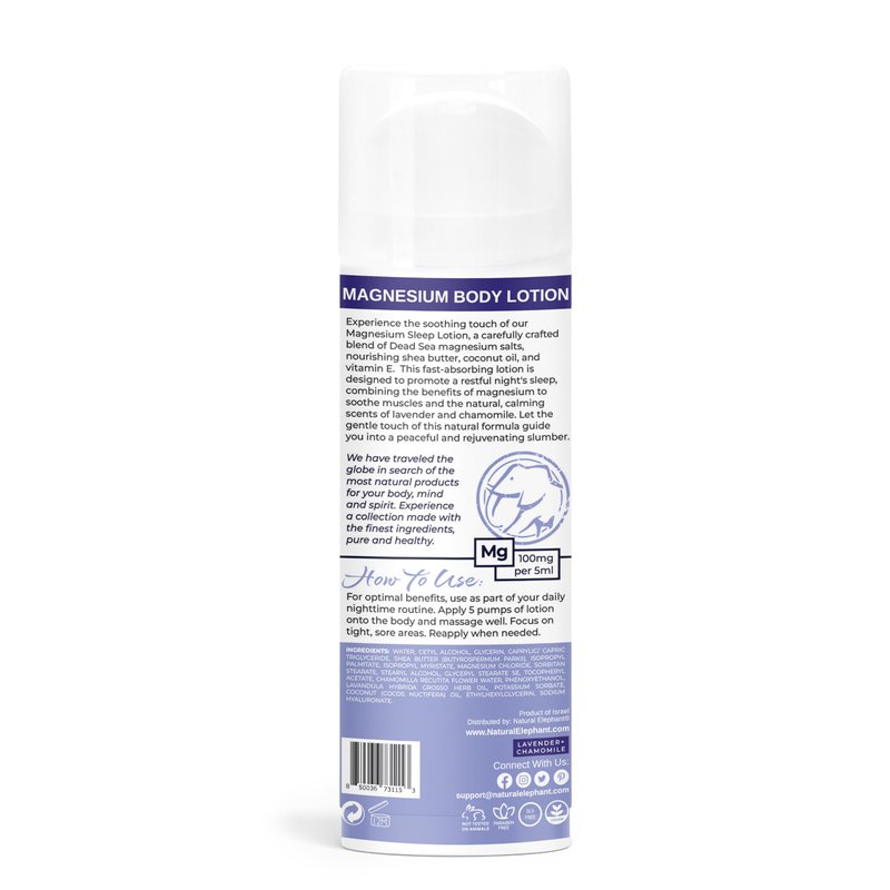 - Ultimate Nighttime Relaxation: Experience the soothing benefits of our Natural Elephant Dead Sea Magnesium Nighttime Body Lotion, infused with lavender and chamomile essential oils. These natural botanicals work together to create a calming atmosphere for a restful night’s sleep.