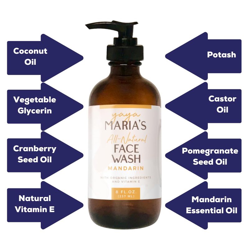 No more chemicals on your face. Removes makeup. Washes off easy. Zero toxins. The most natural face wash there is, made from just 9 all-natural ingredients everyone understands: Distilled water Vegetable glycerin from soybeans Coconut oil Potash Castor oil One essential oil Organic pomegranate oil Organic cranberry seed oil Natural tocopherol (Vitamin E) That's it... only safe ingredients! Quality certified: Cruelty-free certified with Leaping Bunny Vegan-certified with PETA Naturewatch Foundation endorsed Green America certified for being environmentally and socially-conscious USDA-certified 100% Biobased (independently lab-tested), meaning this soap is made entirely from plants, with zero petrochemicals. Formulated and made in-house by Yaya Maria's to maintain quality control. Always made fresh in small batches. Why you’ll love it: Removes makeup Gentle & nourishing Clean & invigorating No chemical residue on the face Mild scent that doesn't linger Great for people & planet: Our soap is biodegradable Comes in BPA-free glass bottle Made in USA using wind energy Ships carbon-neutral & plastic-free Supports kids in need Try it with peace of mind: 30-day money-back guarantee Fast and friendly customer service