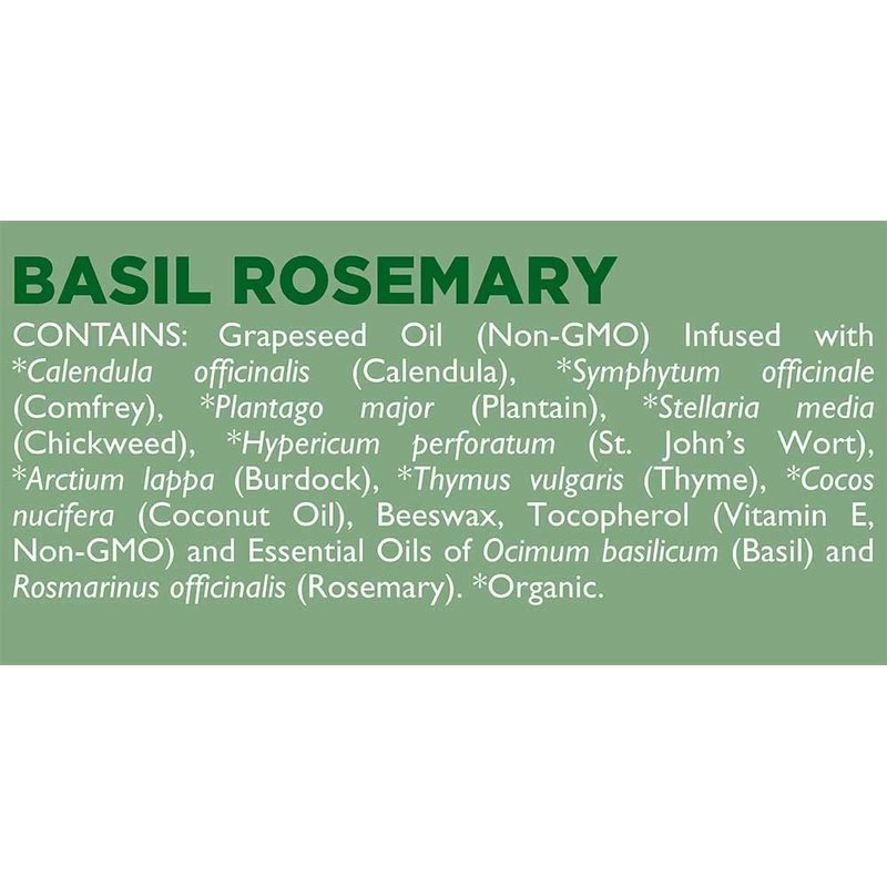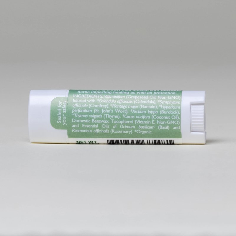 Immune supporting and natural allergy relief essential oils of basil and rosemary are used in aromatherapy to support the immune system and to open physical congestion as well as to uplift and invigorate the spirit. We sometimes even use it around the nose when our children's little noses get irritated during allergy or cold season. This lip balm is a great gift for a child of any age or for an adult who is suffering from seasonal allergies, or a cold, or just could use a little boost! Domestic Beeswax, Vitis vinifera (Grapeseed, Non-GMO) infused with *Calendula officinalis (Calendula), *Symphytum officinale (Comfrey), *Plantago major (Plantain), *Hypericum perforatum (St.John’s Wort), *Arctium lappa (Burdock), *Thymus vulgaris (Thyme), *Cocos nucifera (Coconut Oil), Tocopherol (Vitamin E, Non-GMO), Essential Oils of Ocimum basilicum (Basil) and Rosarinus officinalis (Rosemary). *Organic