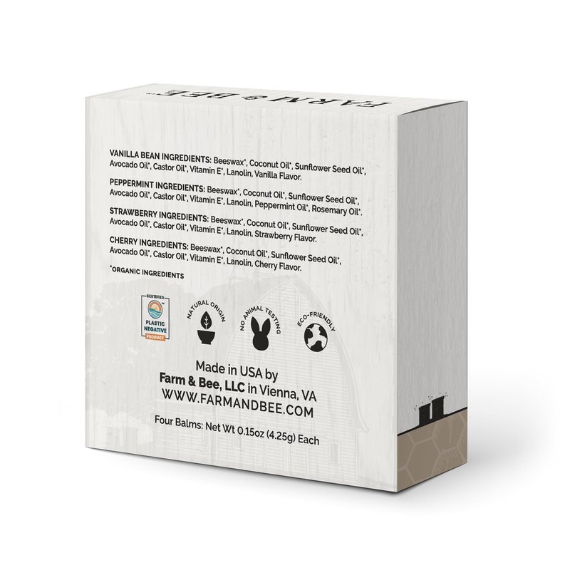Natural Lip Balm – Variety Pack - Organic & Natural Ingredients - Beeswax Based Lip Care Chapstick - Great Gift - Farm & Bee - 0.15oz (Pack of 4 - Vanilla Bean/Peppermint/Strawberry/Cherry)