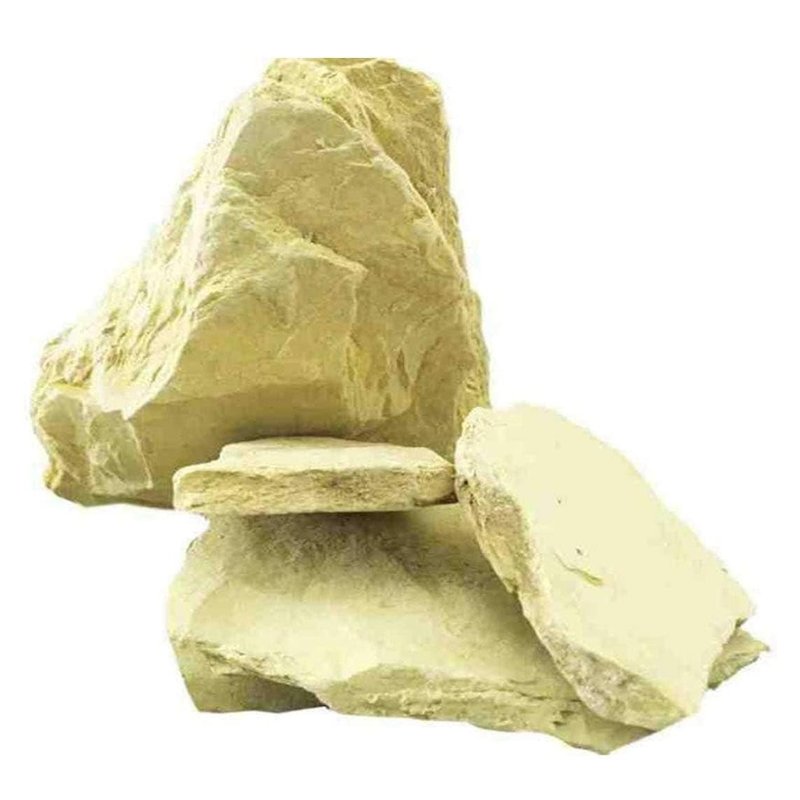 FOUR FAITH Organic Multani Mitti Stone Form, also known as Fuller's Earth Clay, is a versatile natural product that can be used for both face and hair packs. This clay comes in a convenient 500 gram (17.63 oz) pack, making it easy to prepare and use. It is very rich in magnesium chloride which helps to reduce acne. Originally used as an absorbent in the wool industry this ingredient is now greatly used in many skin care products. Fuller's Earth Clay is renowned for its ability to absorb excess oil and impurities from the skin and hair, leaving them feeling refreshed and revitalized. It can help to unclog pores, reduce acne, and improve overall skin texture. When used as a hair pack, it can help to remove buildup, add shine, and promote healthy hair growth. One of the most popular uses of Multani Mitti is for those with oily skin. Multani mitti with rose water makes an excellent face masks for oily skin. For dry skin, add milk and almond paste with it. To reduce blemishes use a pack of multani mitti with tomato juice, turmeric and sandalwood powder. Apply and leave for ten minutes and then rinse it off. It also acts as a wonderful cleanser which brightens the face immediatety. This product is organic and free from harmful chemicals, making it a safe and natural choice for those seeking a gentle yet effective solution for their beauty needs. Whether you're looking to pamper your skin or revitalize your hair, Four Faith Organic Multani Mitti Stone Form is a must-have in your beauty routine