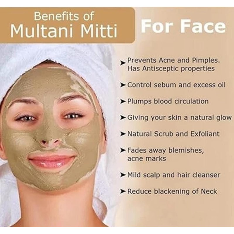 - Versatile Usage: Besides skincare, Multani Mitti can be used in hair care routines as a hair mask to improve scalp health and promote shiny, lustrous hair. It's a versatile addition to your beauty regimen.