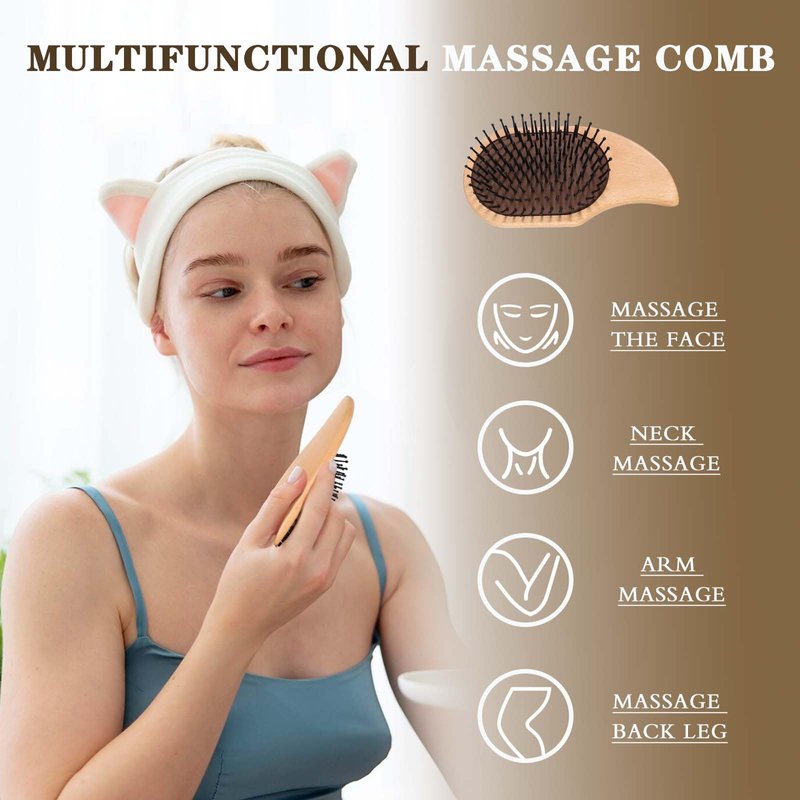 - Skin Care: The lower part of the hair brush is designed with a unique curve that can be used for scraping massage. Using a unique curve to massage the face, hands, and legs for a long time can help promote lymphatic drainage, improve metabolism, and brighten the overall skin, helping to treat dark circles under the eyes.